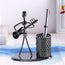 ? The pencil holder is designed with a metal man who is playing musical instruments.